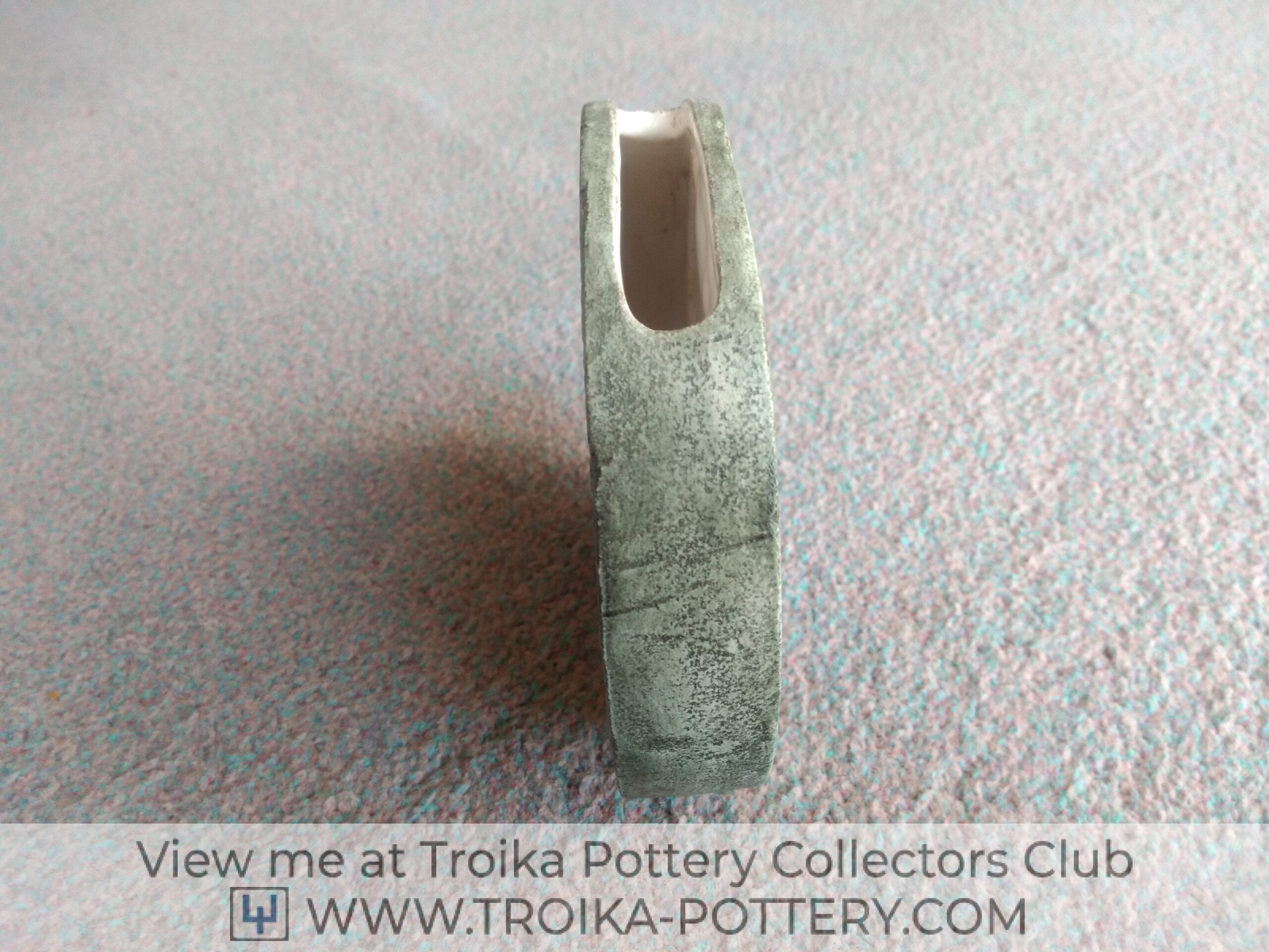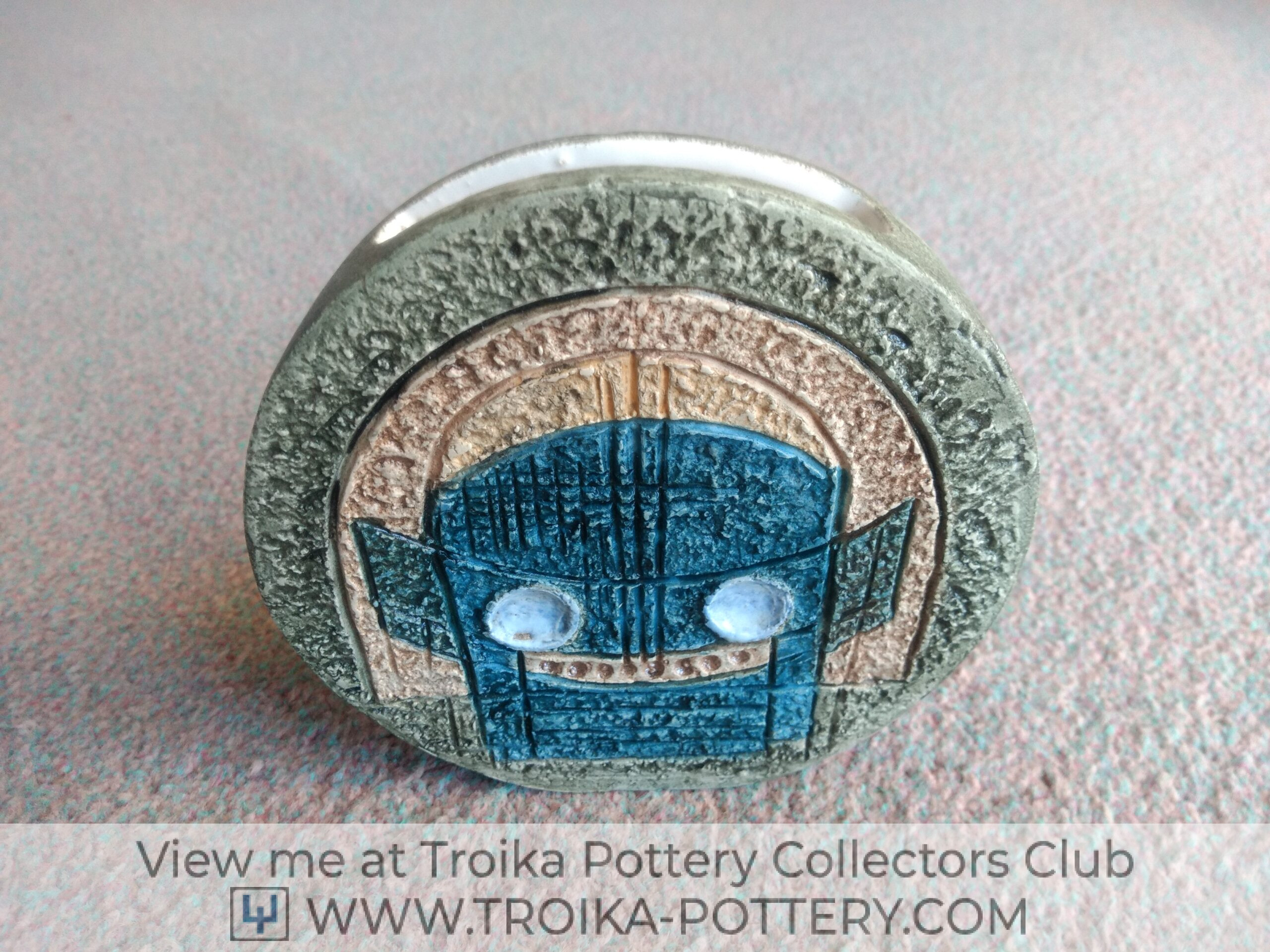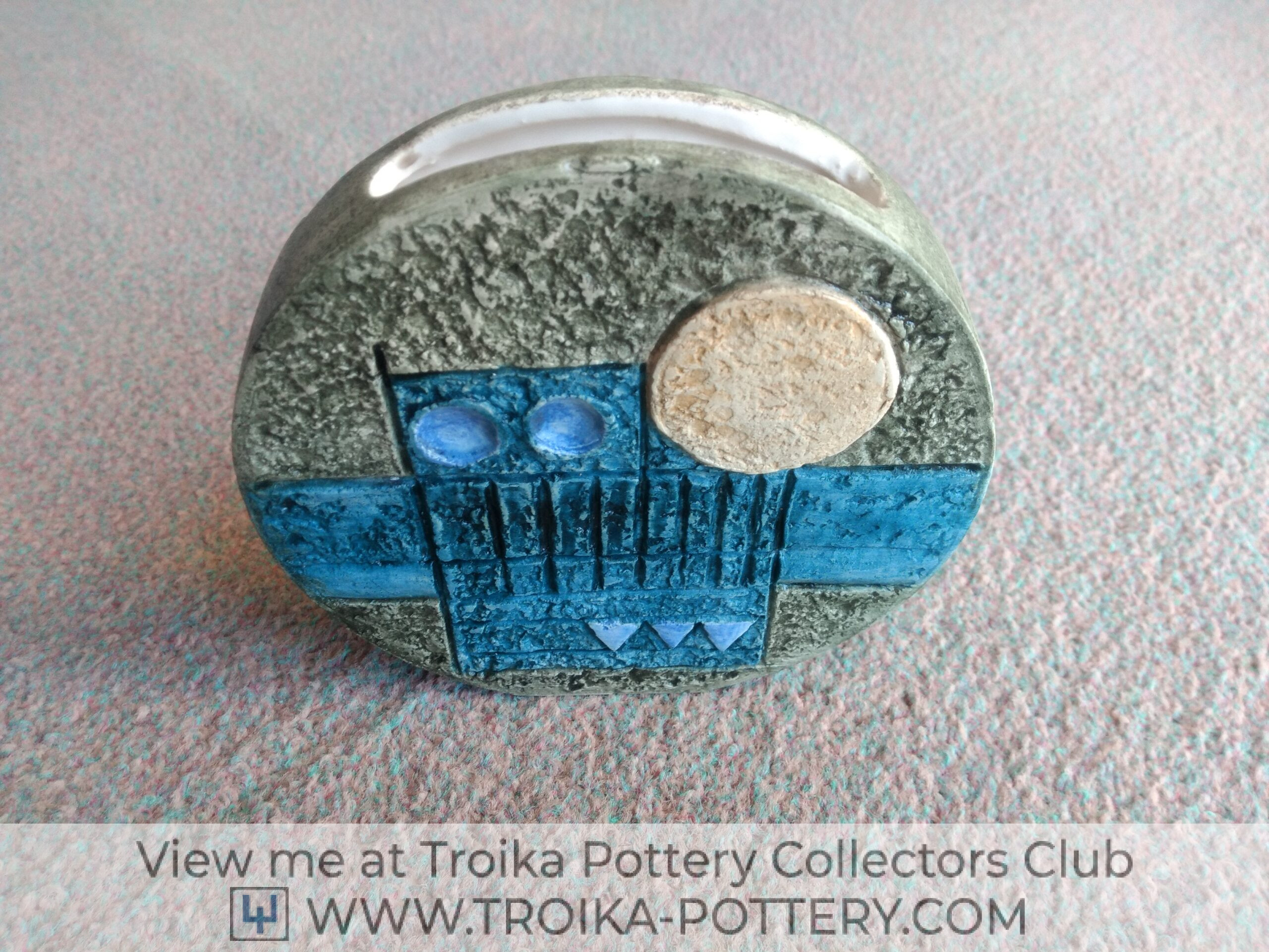 Small wheel vase. Approximately 12.5cm in diameter. Base colour of green with blue & cream decoration. Possible alien depicted on one side. Industrial scene with tower block, river and sun depicted on the other side. Signed ‘Troika LJ’ underneath. Decorated by Loise Jinks 1976-1981.