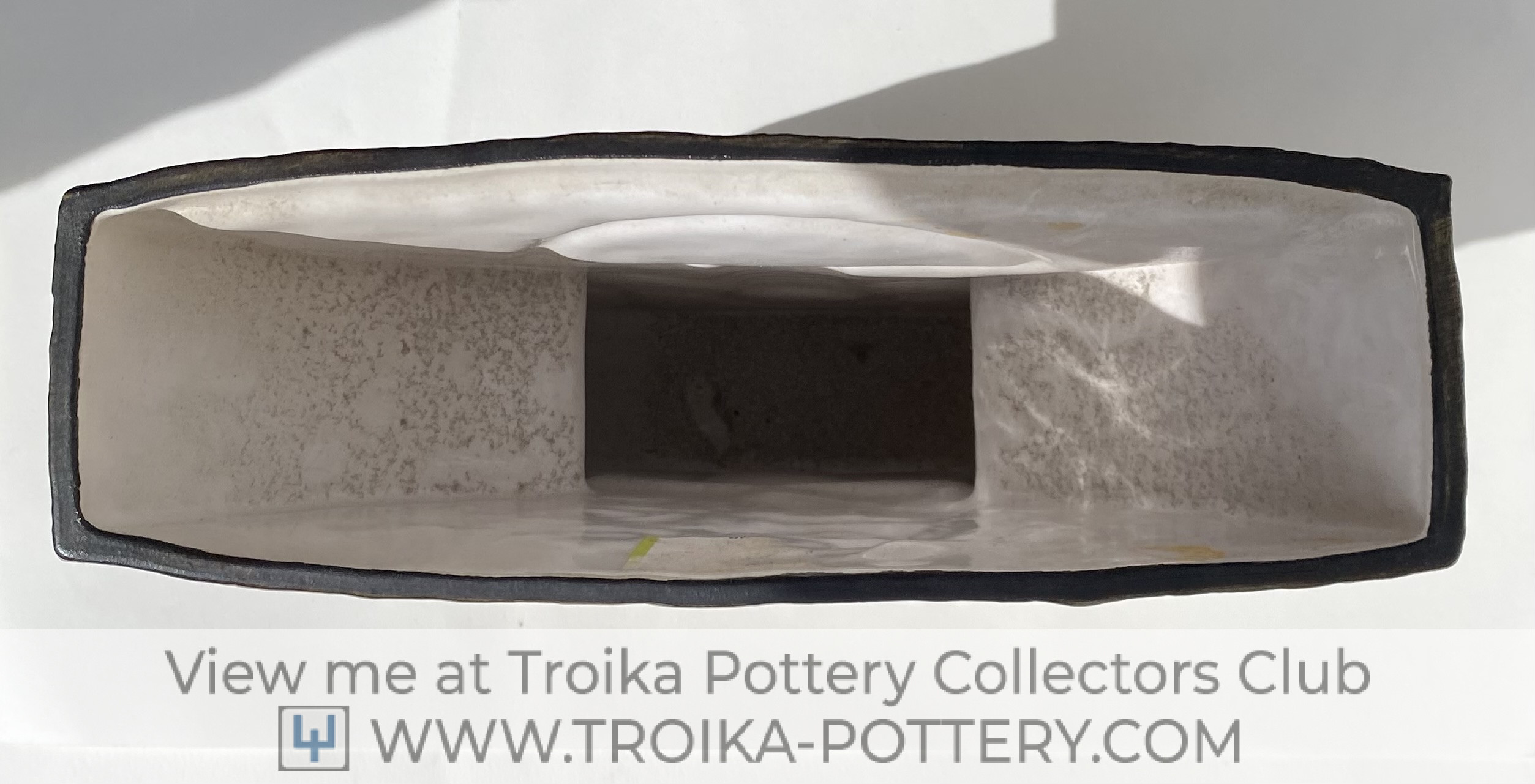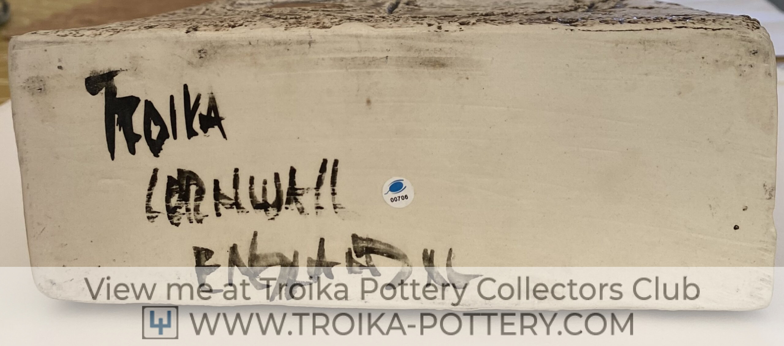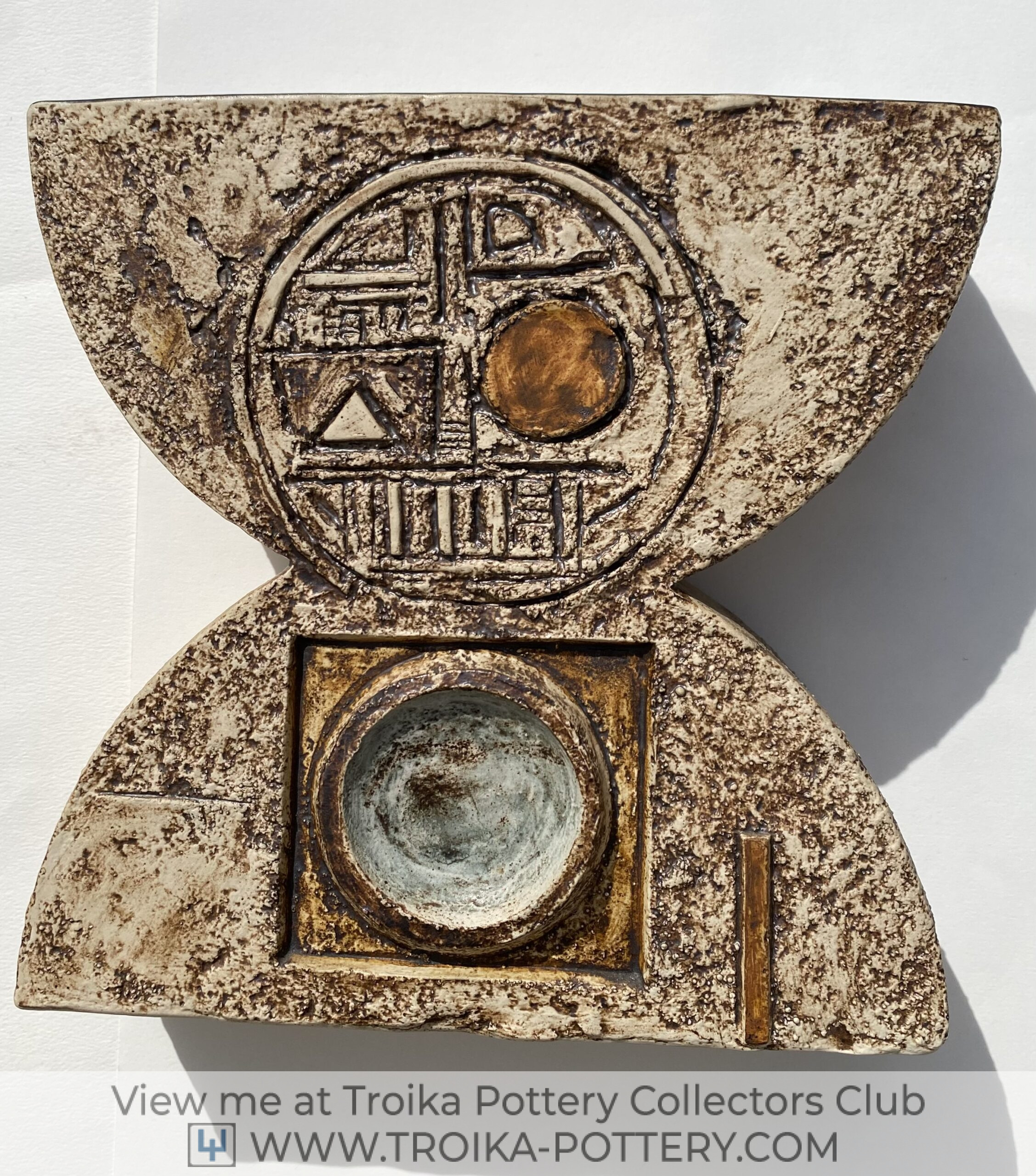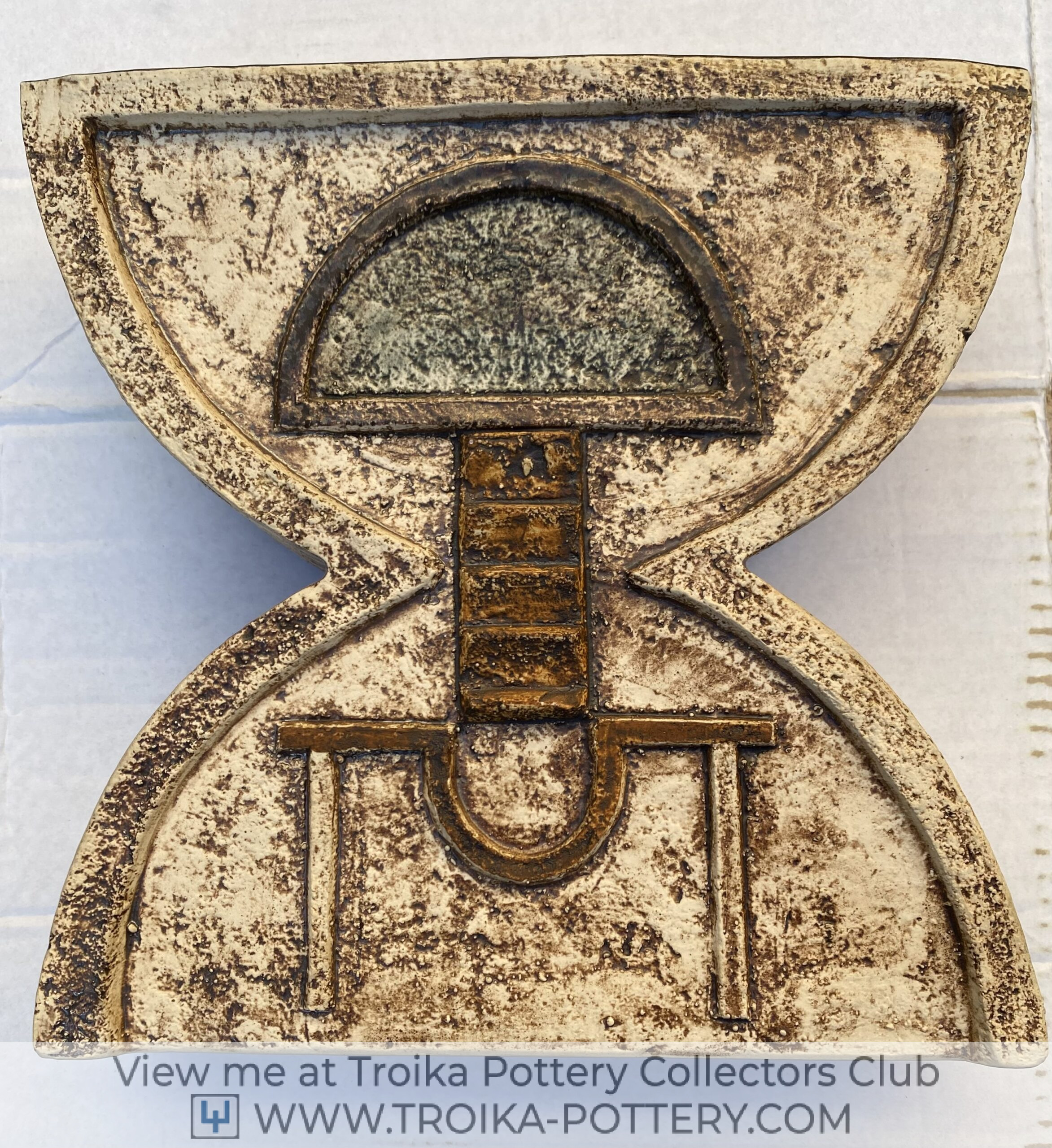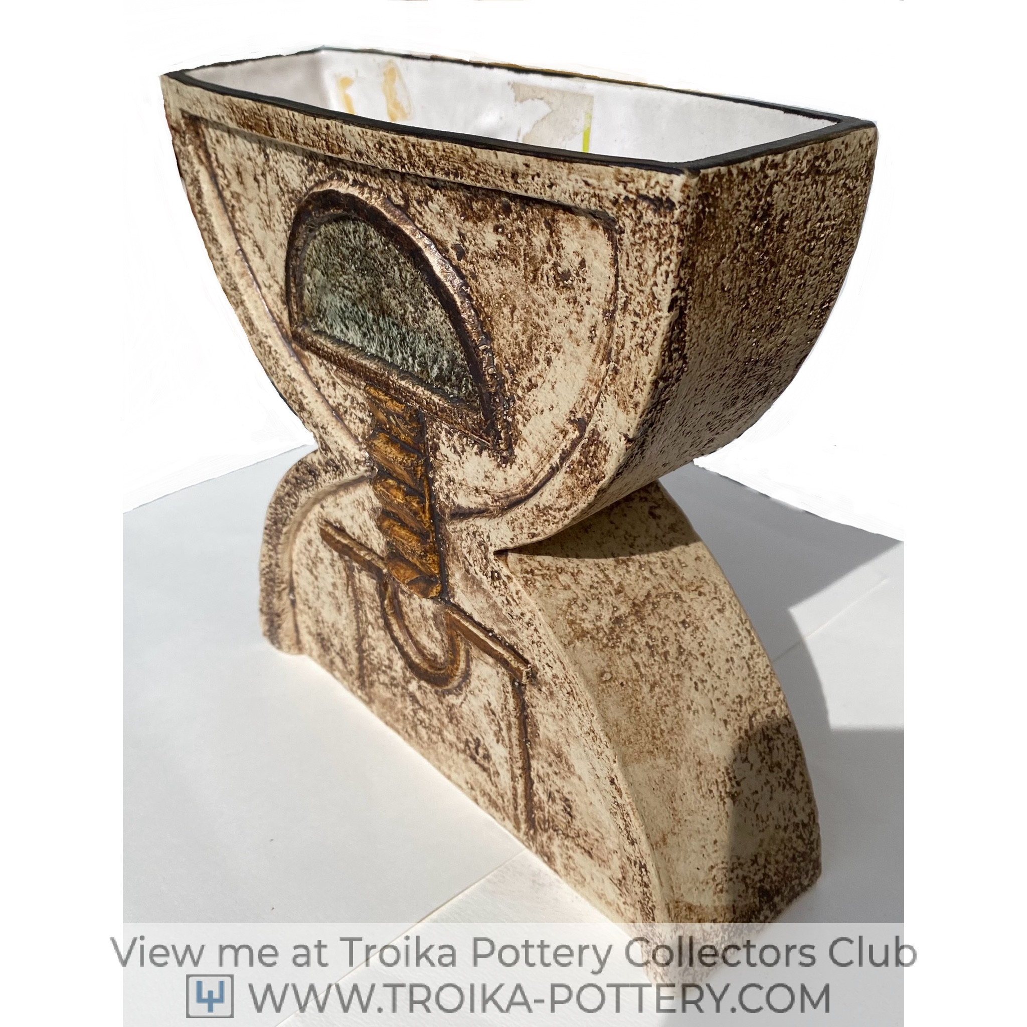 This vase was acquired at public auction and is predominantly an oatmeal colour with a textured finish and designs to two sides in relief. These have been decorated by Anne Lewis in a lovely pale blue green and brown colours. One face has an anvil shape in relief and a Brancusi inspired ladder effect, whilst the other has geometric designs that are in relief and incised. The internal vase has a smooth white glaze finish. Condition grade 10/10 with no chips, cracks or signs of restoration. The Anvil shape is so iconic in terms of the Troika name.