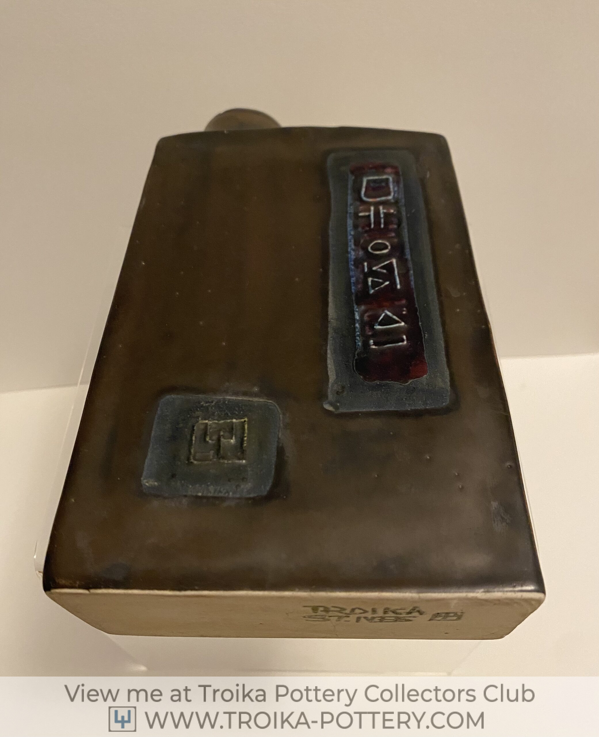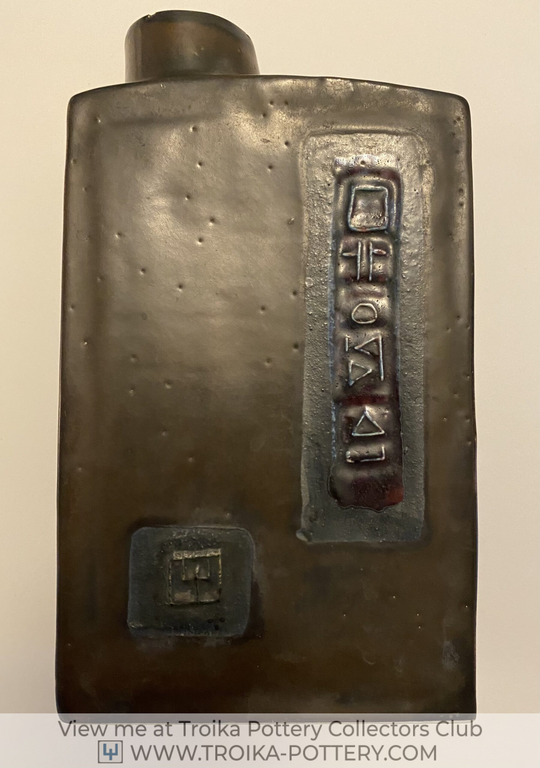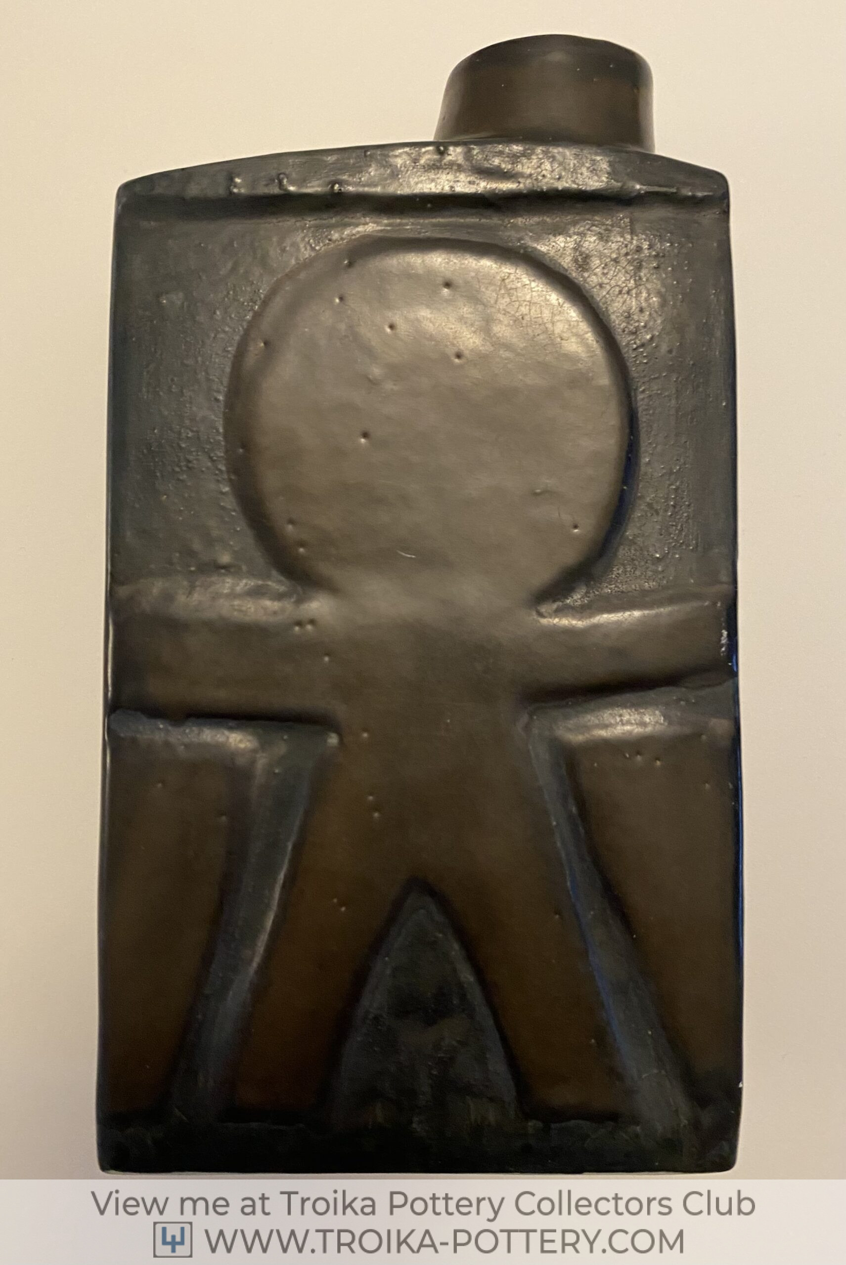 Early St Ives Gingerbread Boy Chimney Vase in a Manganese Oxide glaze (bronze) finish. One face shows the Gingerbread Boy design in relief, and the other face a vertical design of symbols and then lower left, the Trident Mark, both in relief. Underglaze of blue showing through as well as a red glaze beneath the line of symbols. It has a painted Troika St Ives to the base, and painted Trident Mark.