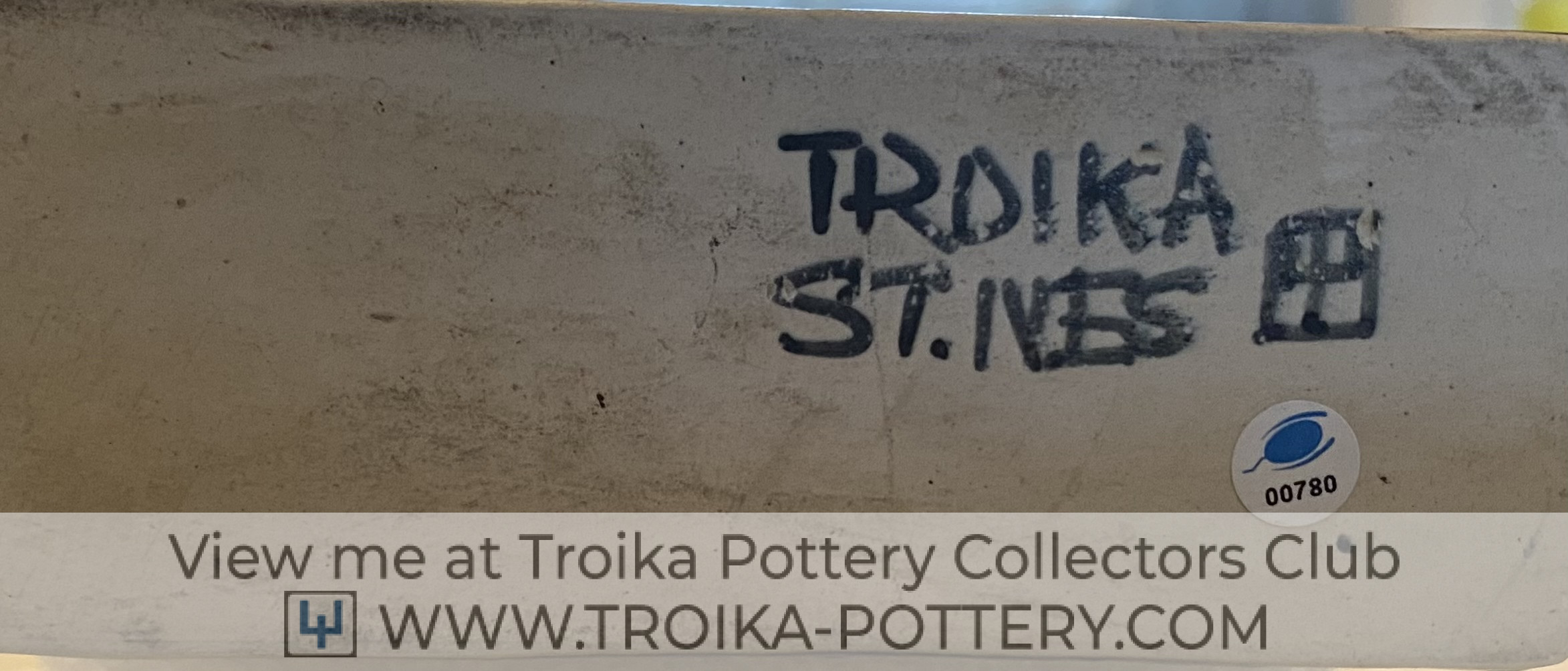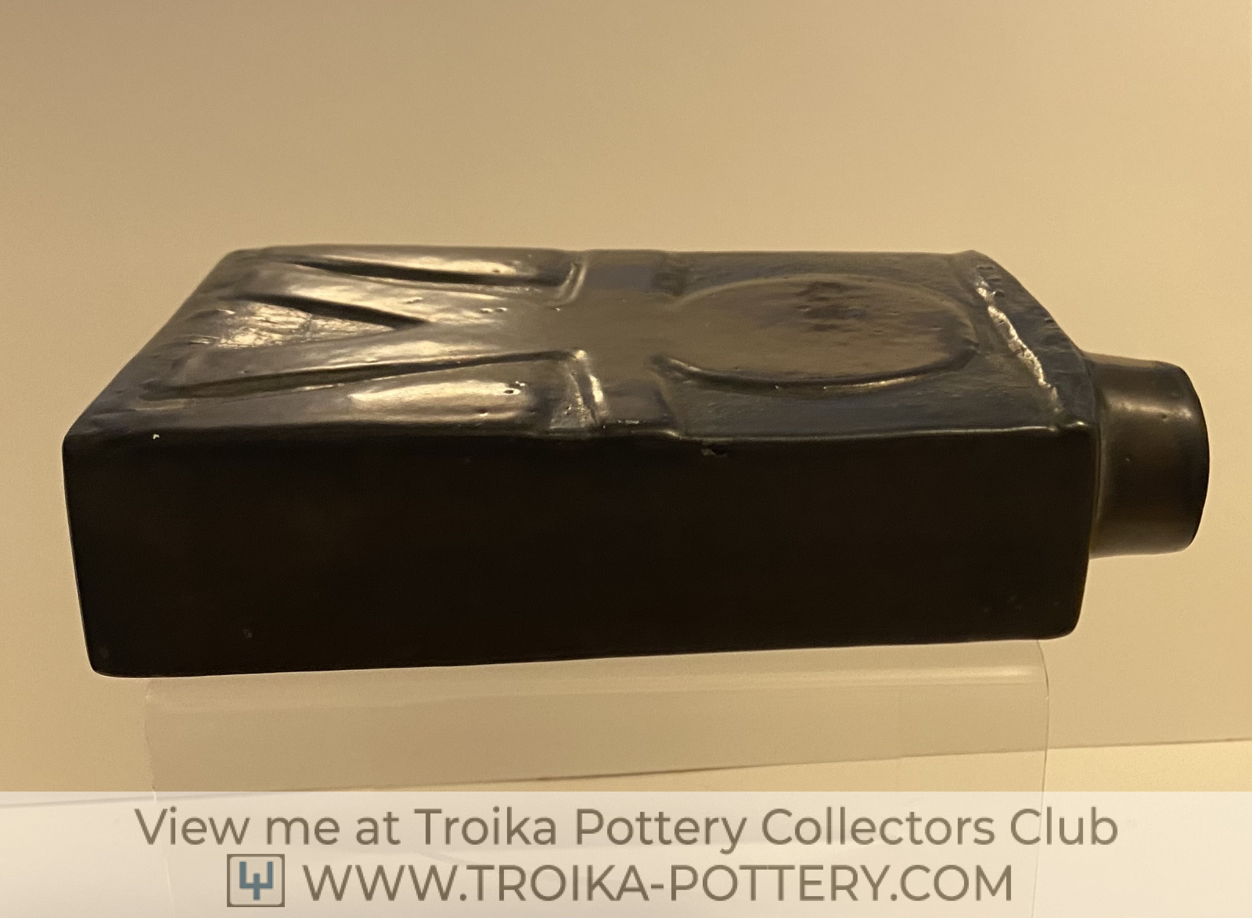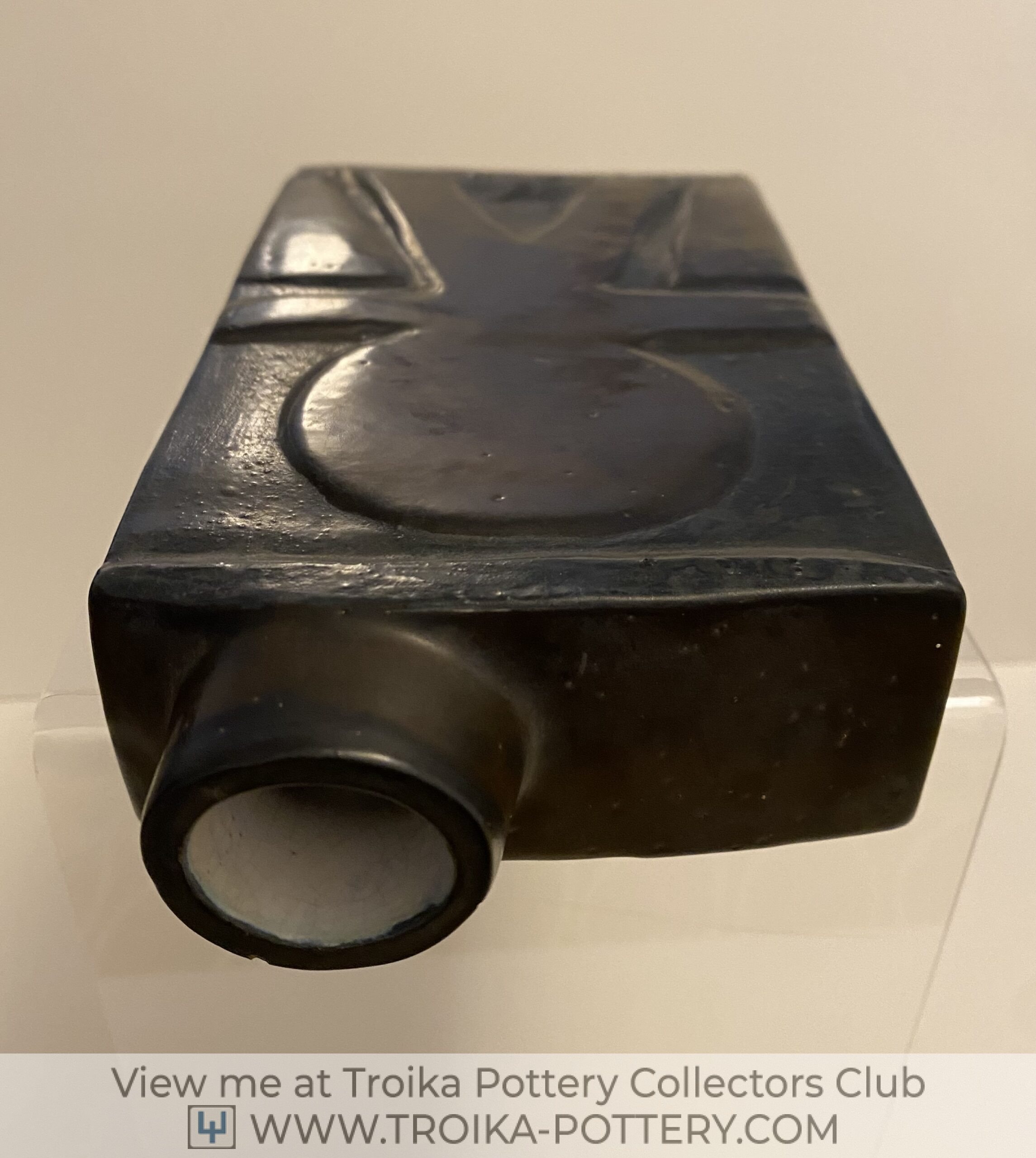 Early St Ives Gingerbread Boy Chimney Vase in a Manganese Oxide glaze (bronze) finish. One face shows the Gingerbread Boy design in relief, and the other face a vertical design of symbols and then lower left, the Trident Mark, both in relief. Underglaze of blue showing through as well as a red glaze beneath the line of symbols. It has a painted Troika St Ives to the base, and painted Trident Mark.