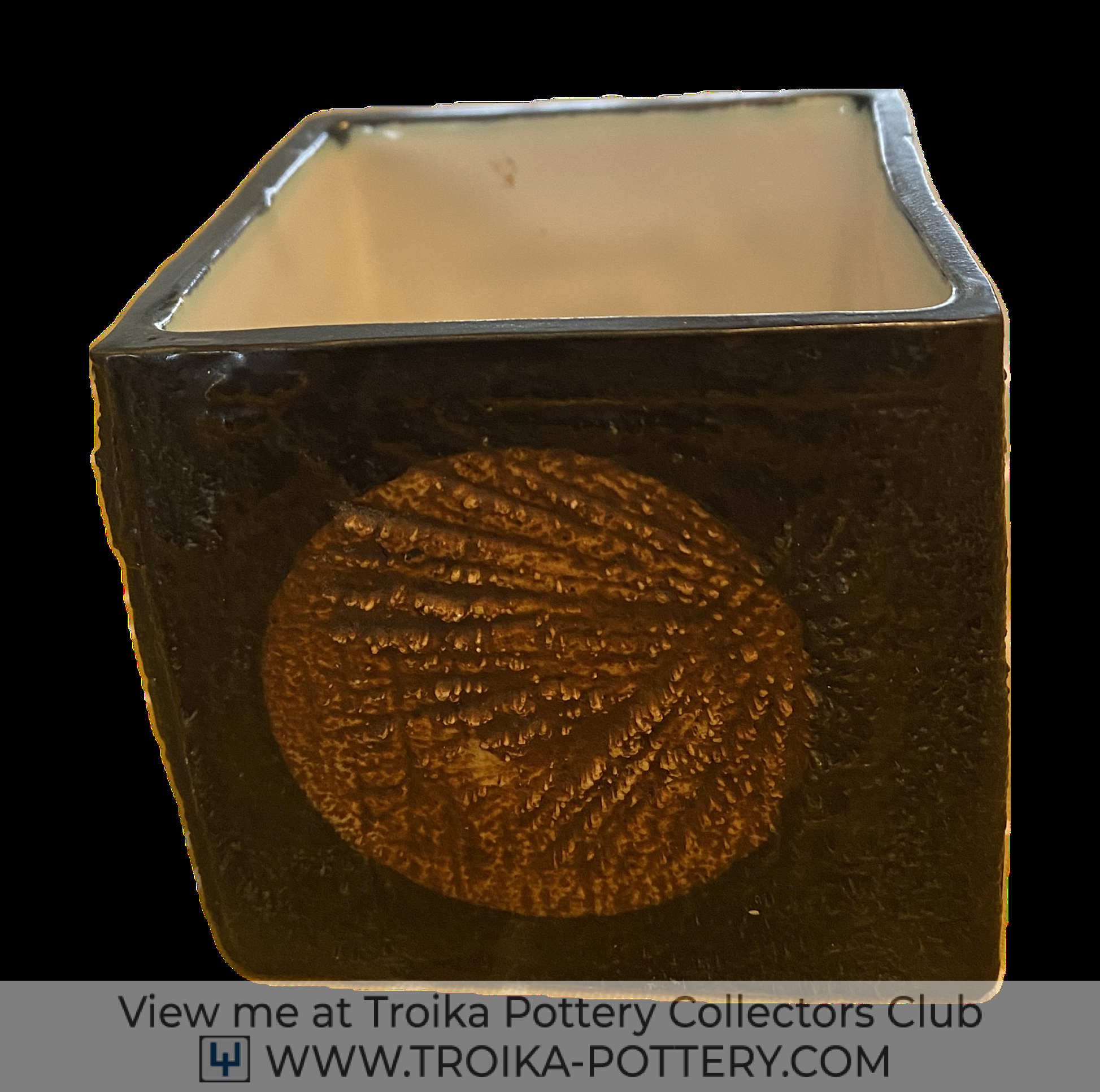 Early Small Cube Vase in black with blue undertones and four circles decorated in a bright oatmeal colour. Stamped Troika St Ives England to the base.