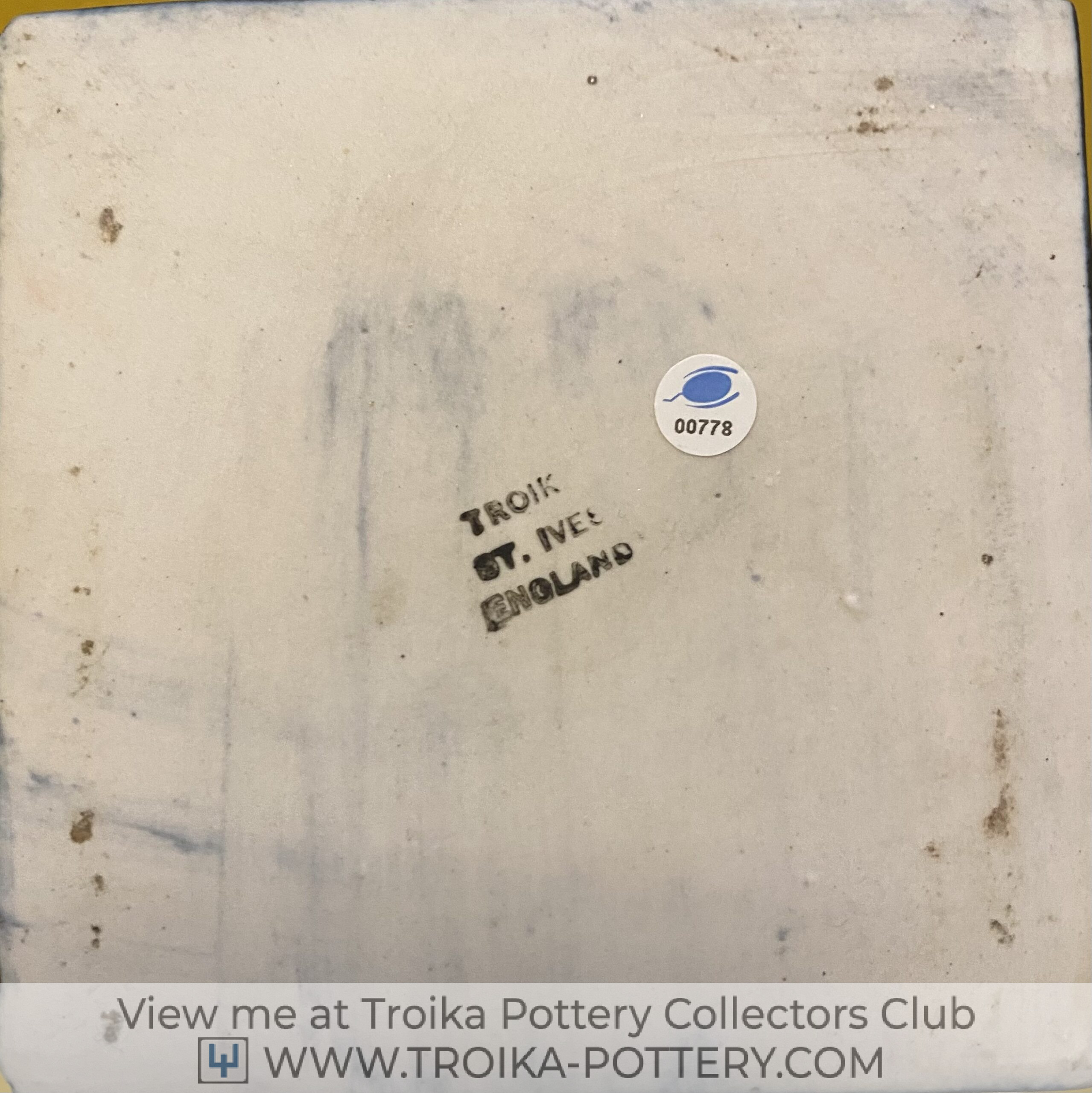 This is the only small cube vase that I’ve come across that has a black body (with some blue undertone). It has four individual circles to each face, painted in a bright oatmeal colour. The whole body has a textured finish and it has the early Troika St Ives stamp to the base. Condition 10/10