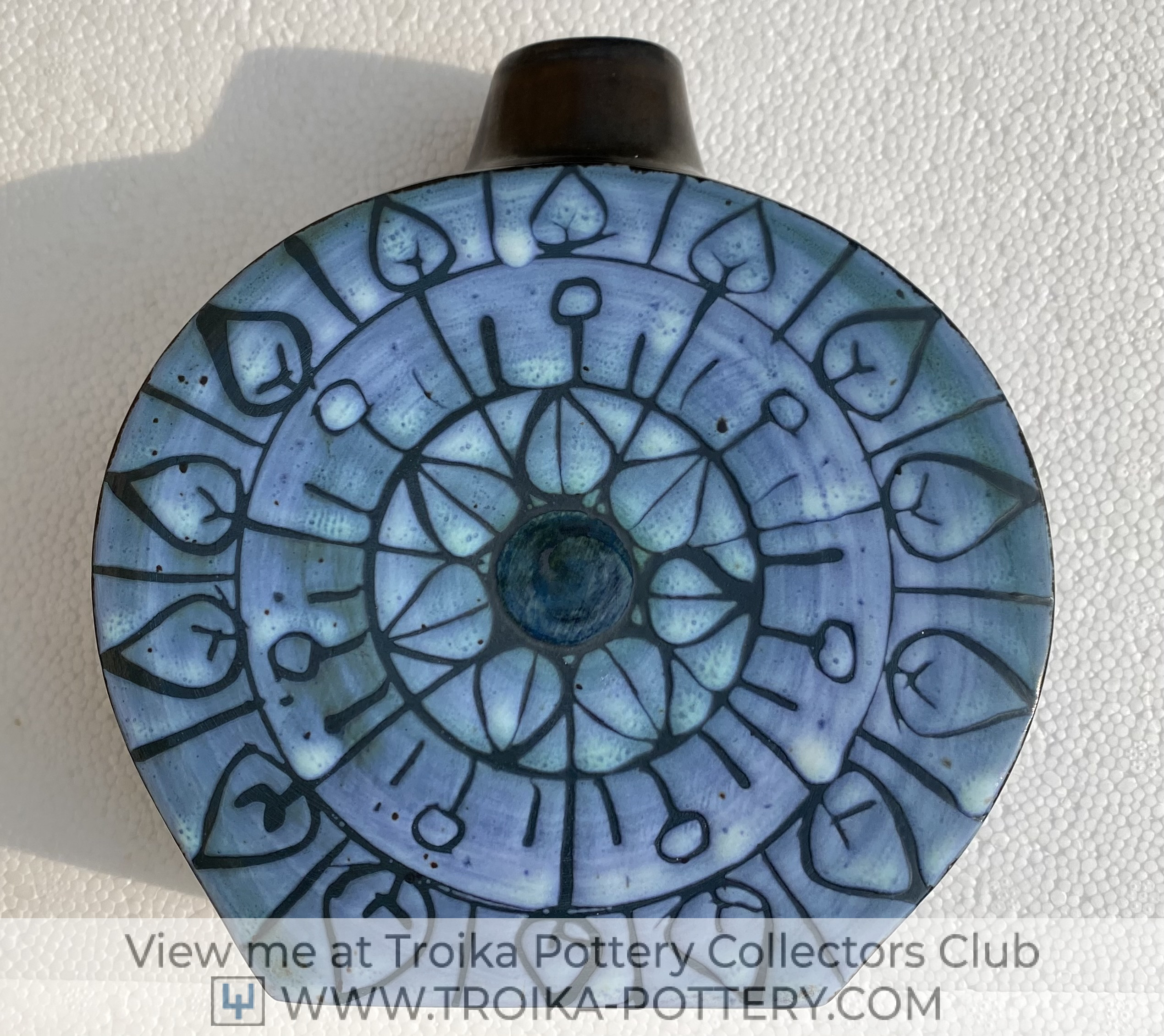 Manganese oxide glaze to the main body giving a bronze patina, and two stylised floral circular incised designs to both faces, painted in a blue tin glaze with subtle green hues